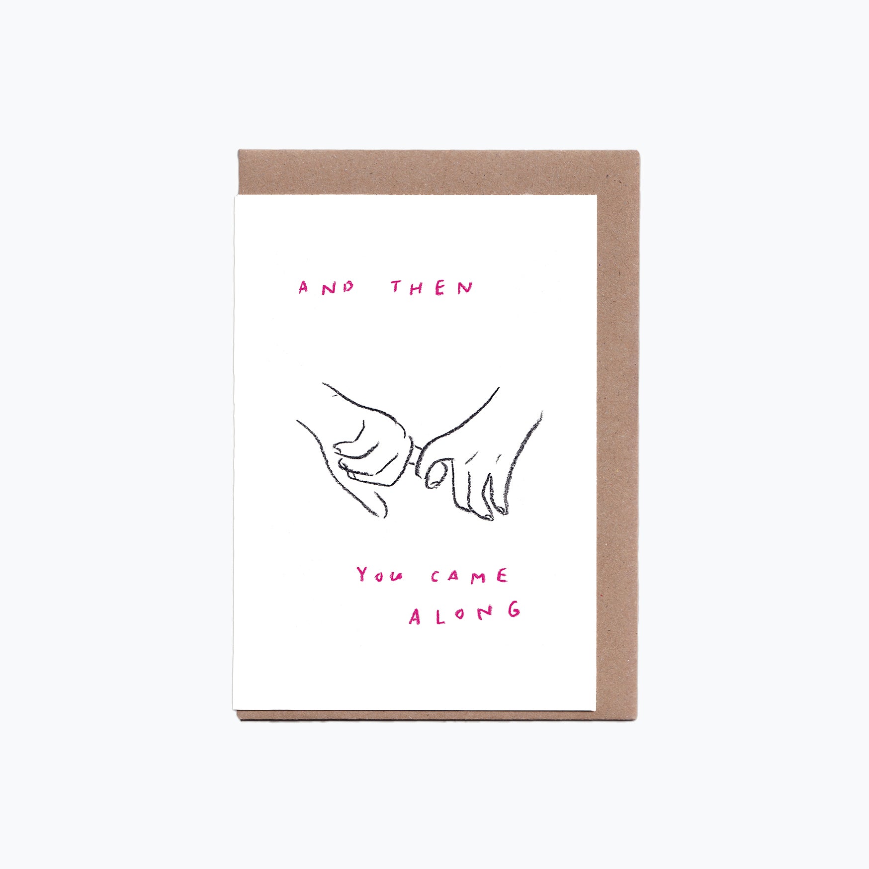 Inspired by the beauty of small gestures and the simple yet profound impact a person can have on your life, this card is a heartfelt way to express your feelings. Featuring a hand-drawn illustration of a pinky promise and the sentimental phrase, “And then you came along”, this card is the perfect choice for hopeless romantics or anyone who cherishes little moments that can mean everything.