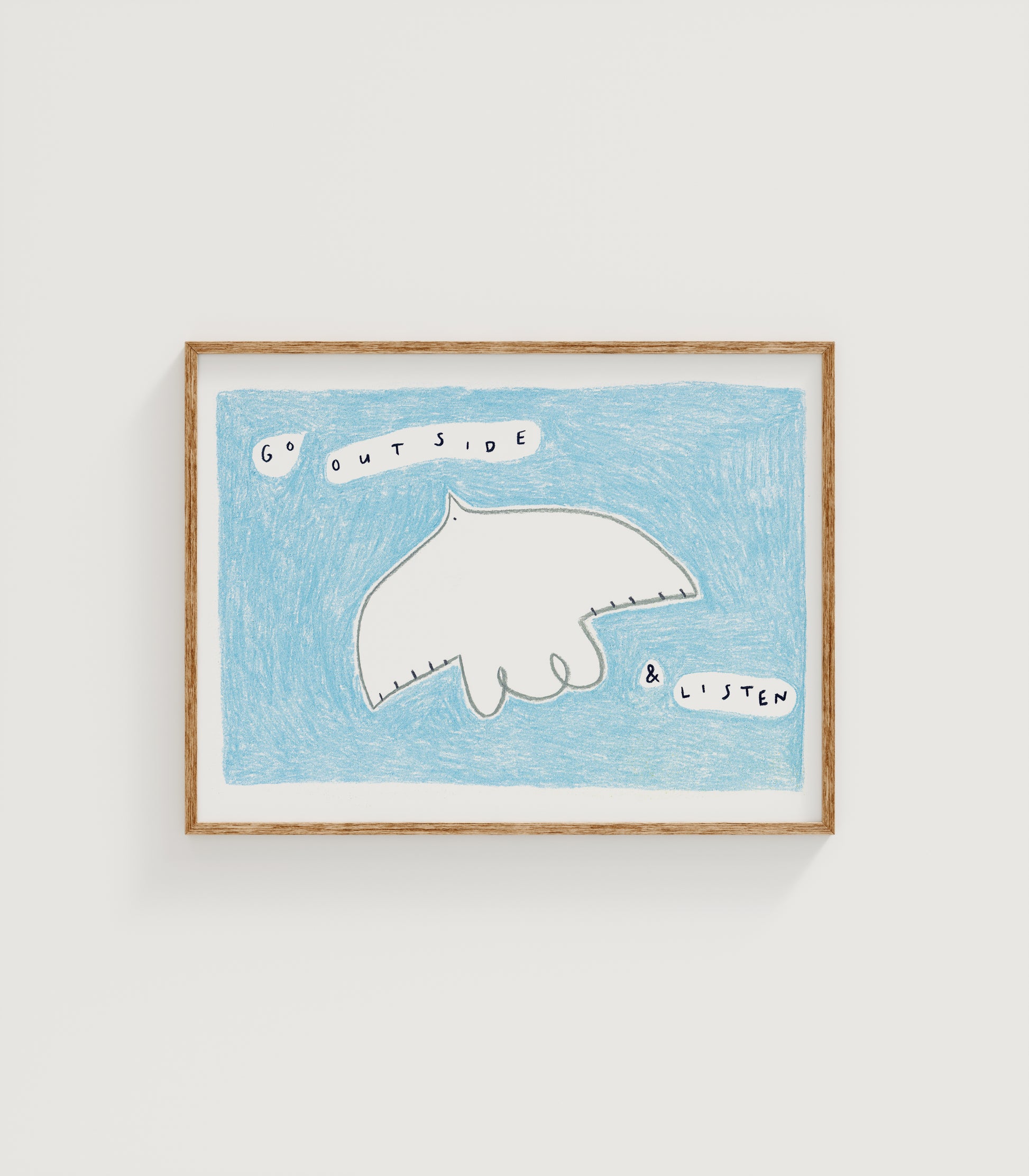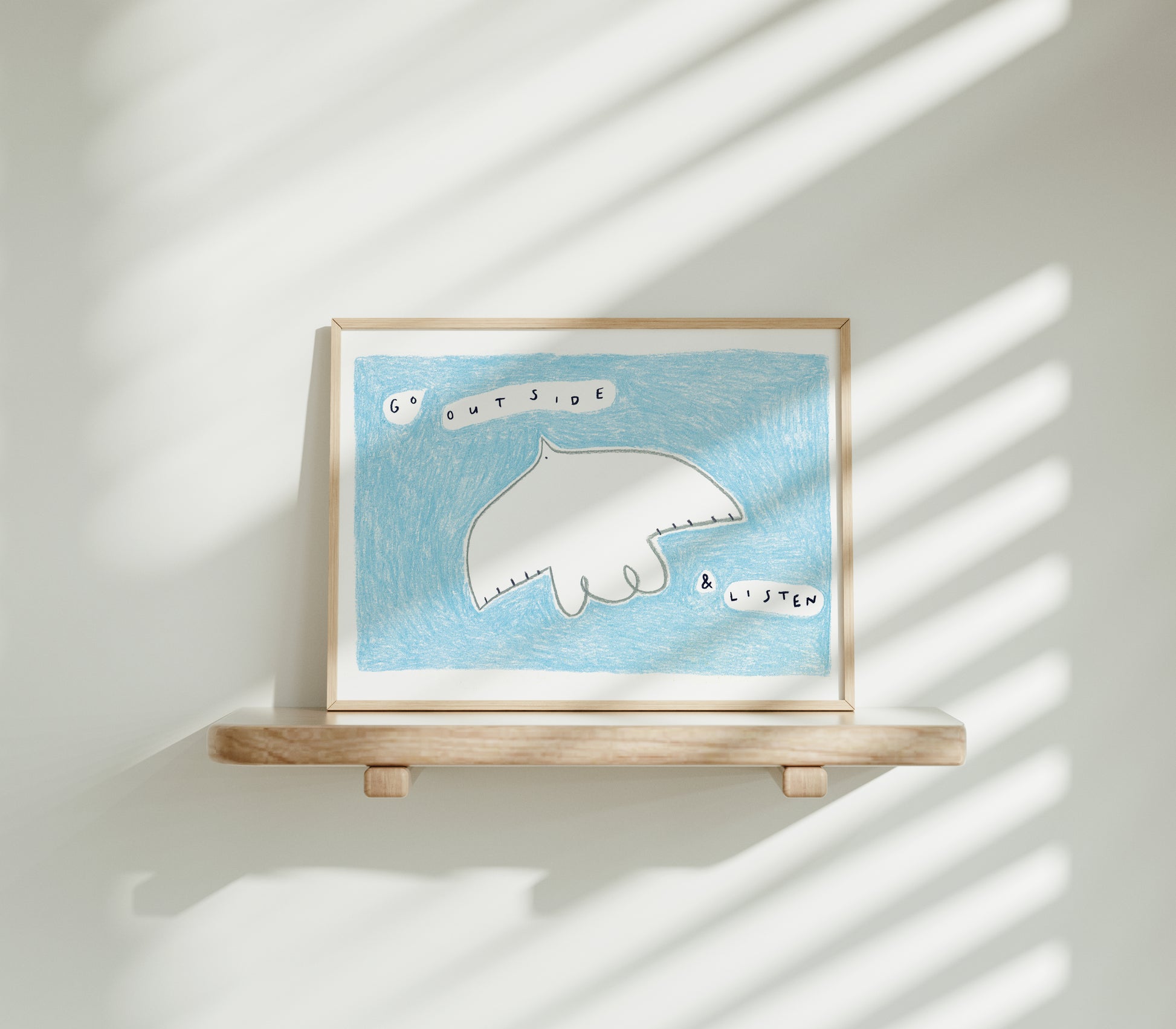 This piece was inspired by a moment of feeling overwhelmed and the simple, grounding act of stepping outside without headphones. Taking a walk and listening to the birds offers a reminder to breathe, be present and reconnect with yourself. Created as a reflection of that feeling, this artwork serves as reminder to slow down and re-centre amidst the noise of daily life.