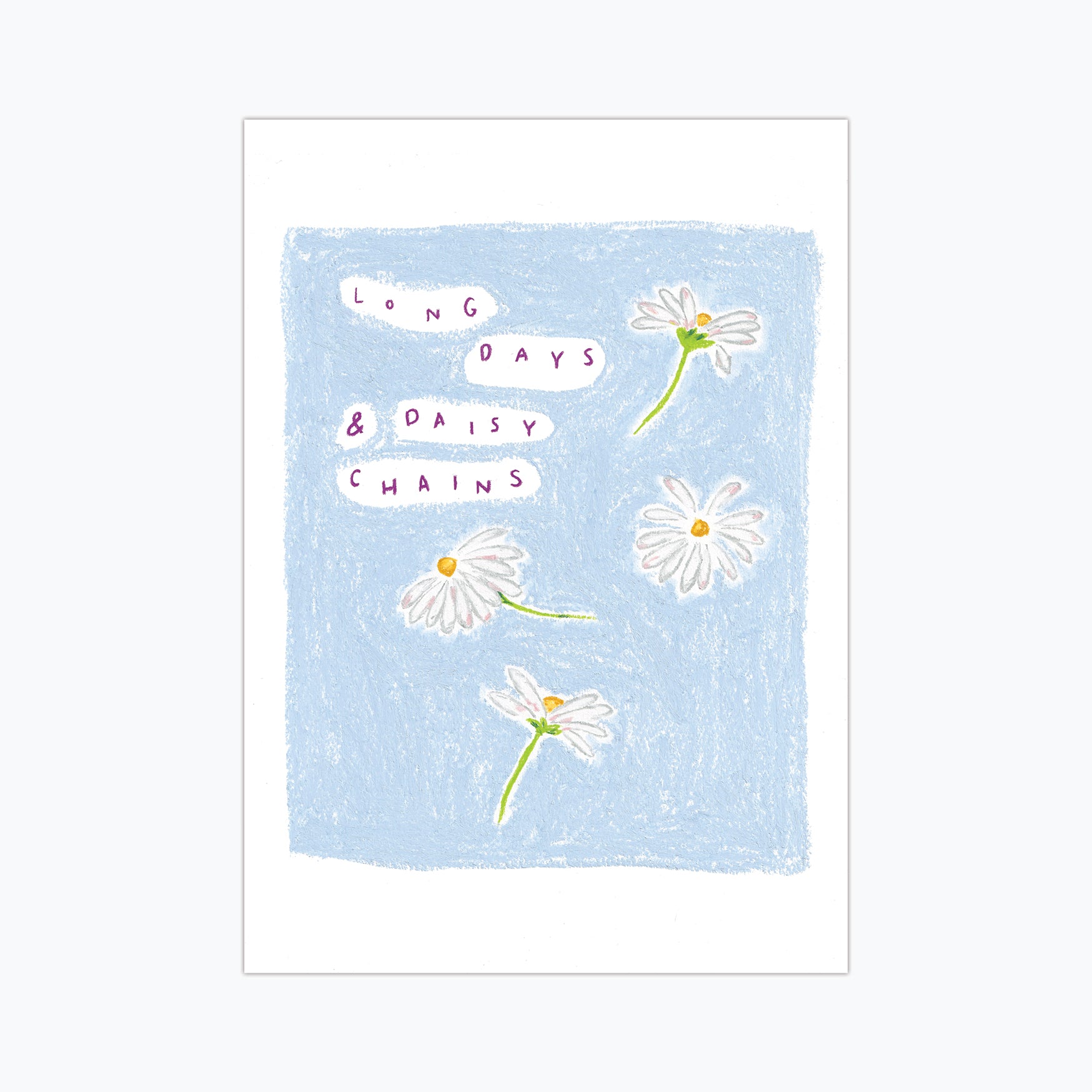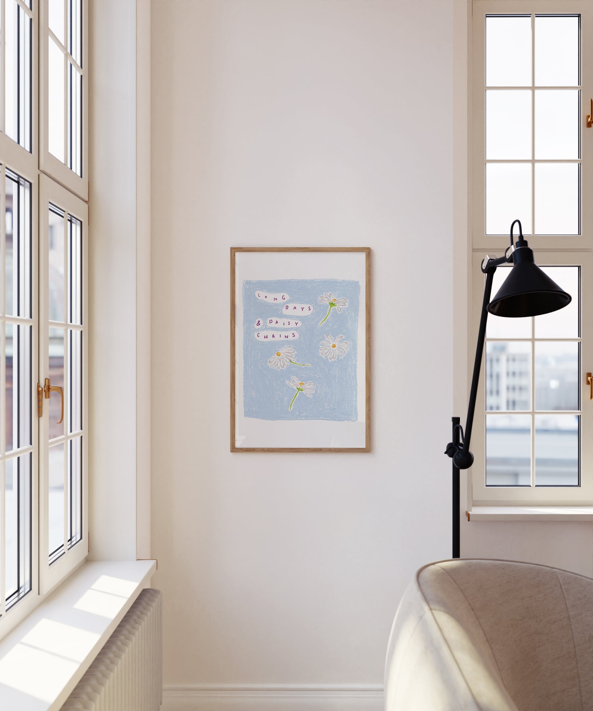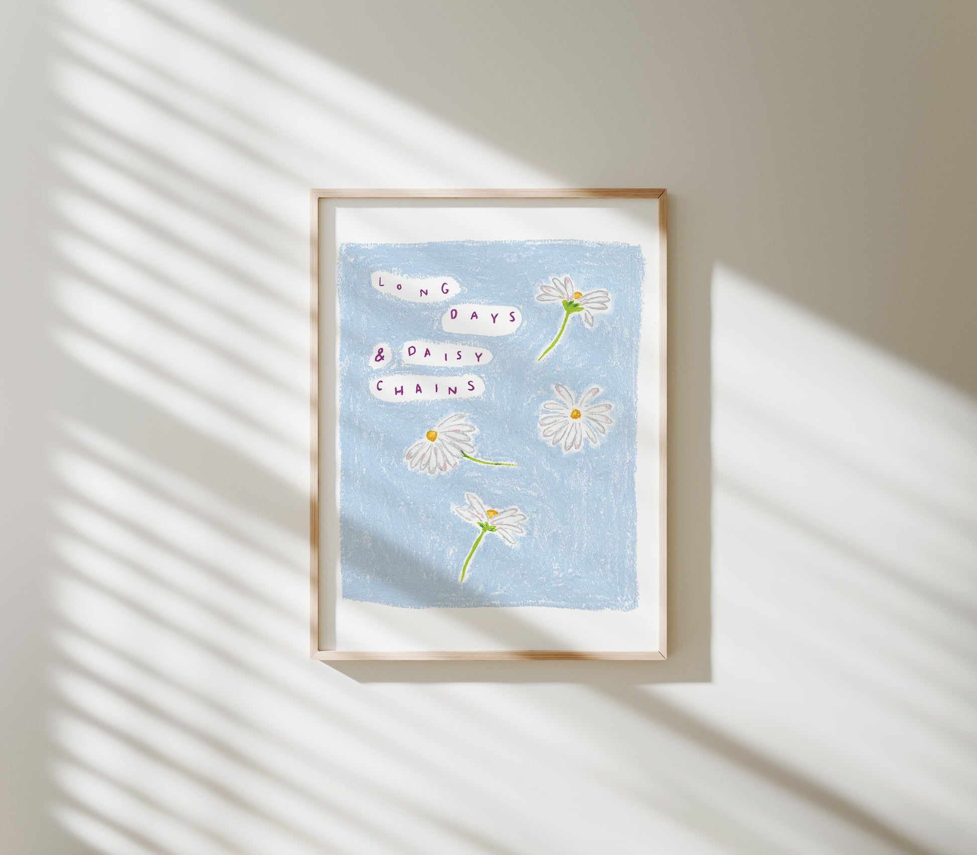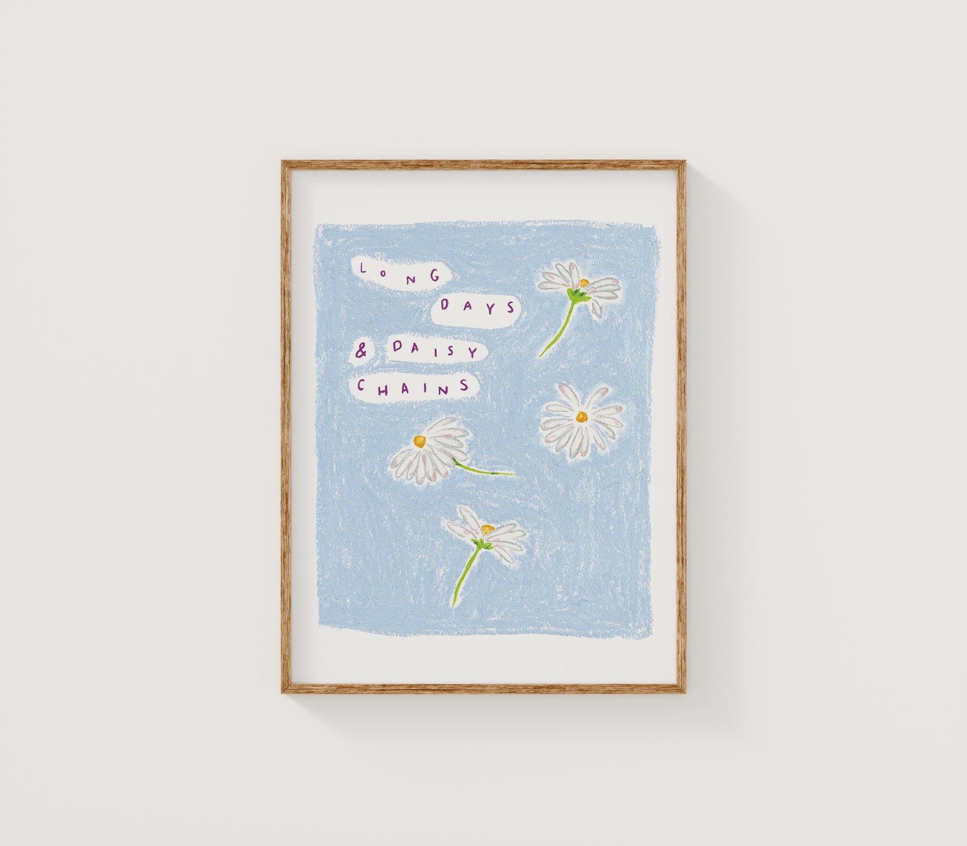 This print is a nostalgic ode to childhood summers, inspired by those endless days spent sitting in fields and park, making daisy chains under the warm sunshine. It captures the simplicity and magic of those carefree moments when time seemed to stretch on forever. Perfect for bringing a touch of whimsy and warmth to any room, this piece is a gentle reminder of the joy found in life’s simplest pleasures. Ideal if you’re looking to create a cosy, nostalgic atmosphere in your home.